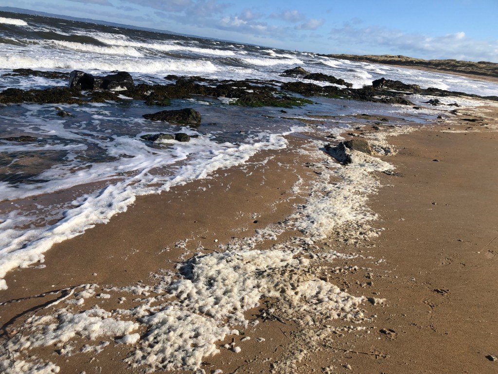 On the beach itself there were large deposits of sea foam also called spume. This is apparently an indication of a productive sea ecosystem. Sea foam is created when strong winds generate large numbers of breaking waves in an area that contains a large amount of dissolved organic matter, such as proteins and fats present in the water. Algal blooms are one common source of the organic matter required to create the sea foams. These may have increased after the strong sun on Saturday on the seaweed and other growths in the sea. However, in some cases they can come from sewage and detergents that have made their way into the water. Maybe a bit of both?